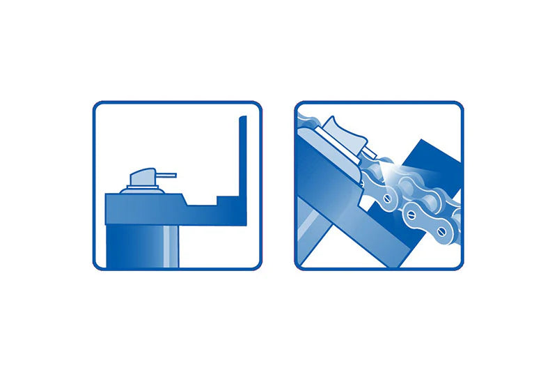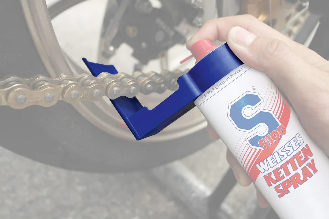 - Place S100 Chain Spray Splash Guard on the can, position the splash guard behind the chain near the chain wheel and spray a thin layer of chain spray on the inside of the chain. That´s it.
