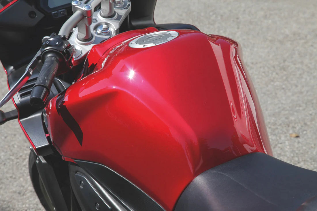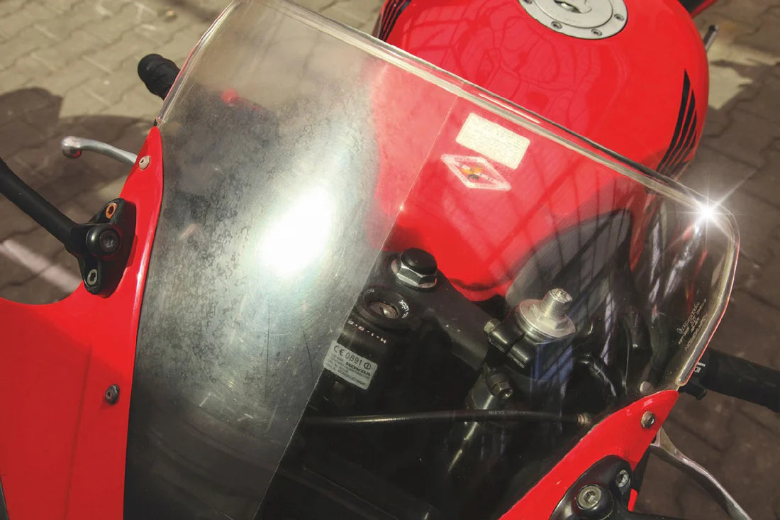 Painted motorcycle parts, e.g. casing, tank etc. Hard, transparent plastic, e.g. headlights, blinkers, windscreen. Solid-coloured, unpainted plastic, either rough or matts finish, cannot be polished e.g. back of mirror)