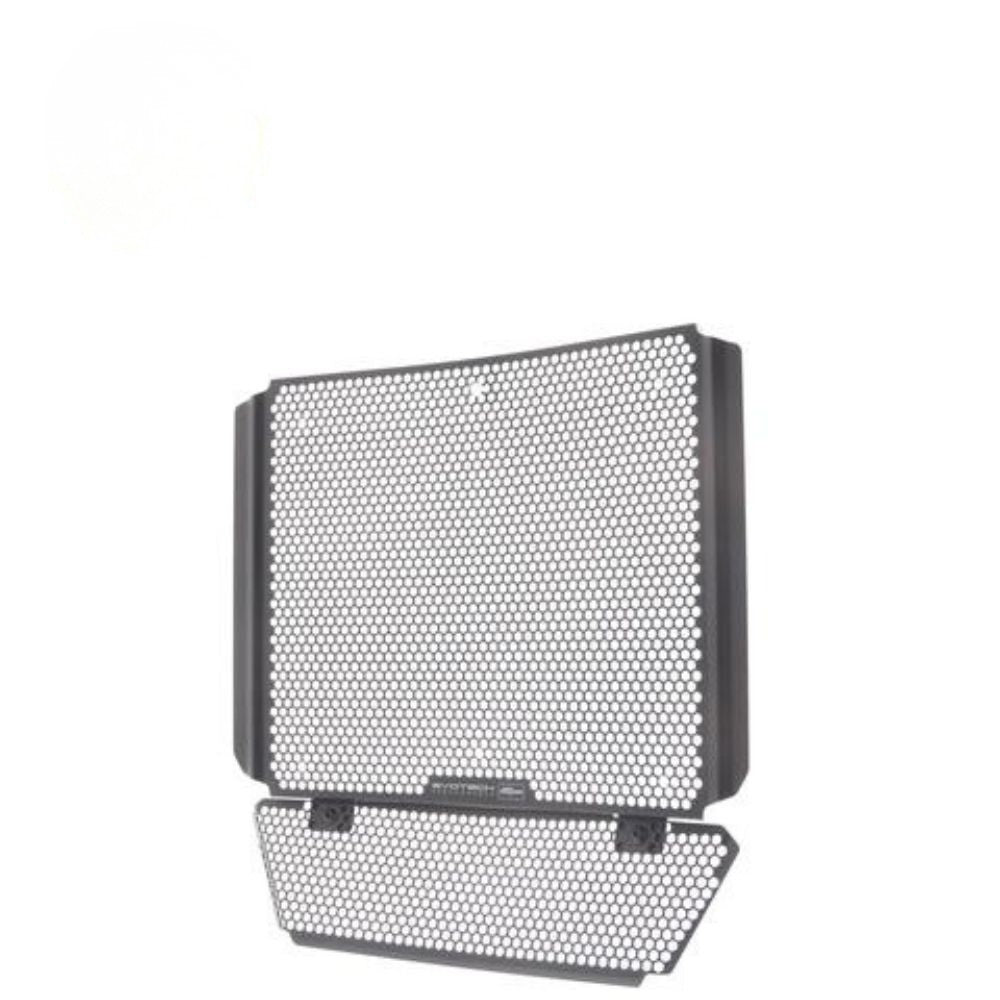 An EP radiator guard protects the Aprilia RS660 radiator from damage while allowing cooling air to pass through - and look good at the same time. A radiator's delicate cooling fins easily bend, and misaligned fins can cause overheating. The radiator's internal cores can also be holed by stones, etc; all usually picked up and flung directly into the radiator from the bike's front tyre or from other traffic. Leaking coolant will make the motorbike inoperable because of overheating, which can result in engine damage.