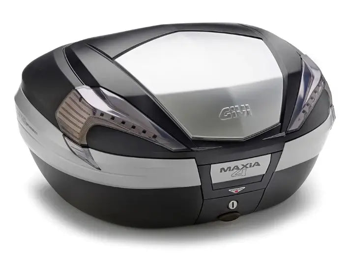 Motorcycle top case with a 56-litre capacity. The appearance of the V56NT, the fourth generation MONOKEY® MAXIA top case, stands out with its black cover, smoked reflectors, and anodised aluminium finish.