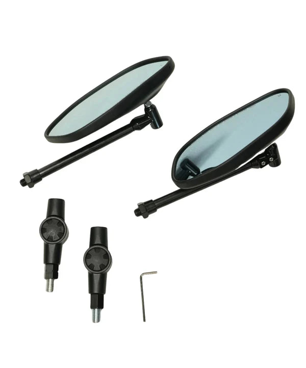 KOLGA BROS foldable motorcycle mirrors, with 6 axis folding knob feature, enhance safety and convenience by allowing riders to easily adjust and stow their mirrors, especially on trails. These mirrors are designed for easy installation on most motorcycles and scooters, offering a wide field of vision and a sleek, modern look.