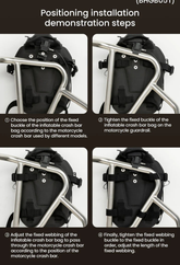 Security is prioritized with an anti-theft system featuring Duraflex buckles and compatibility with Loboo case locks. The adjustable strap fixing system provides a universal fit for 25mm crash bars, allowing for secure attachment on a wide range of motorcycle models.