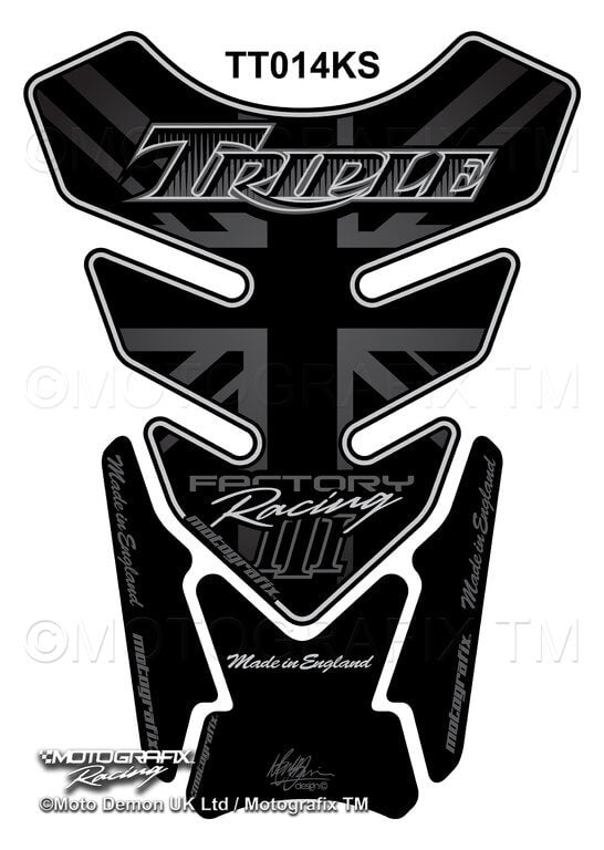 Available in various styles, including Union Jack (white/black/grey/metallic silver), black/gold, black, and others—tailored to fit Triumph Speed Triple (up to ~2010), Street Triple (up to ~2012), and Daytona 675 (up to ~2012) using a universal size of approx. 210 mm height × 150 mm width. Triumph Motorcycle Tank Pad Protector for Speed Triple / Street Triple / Daytona etc ( generic / universal - three cylinder models ).