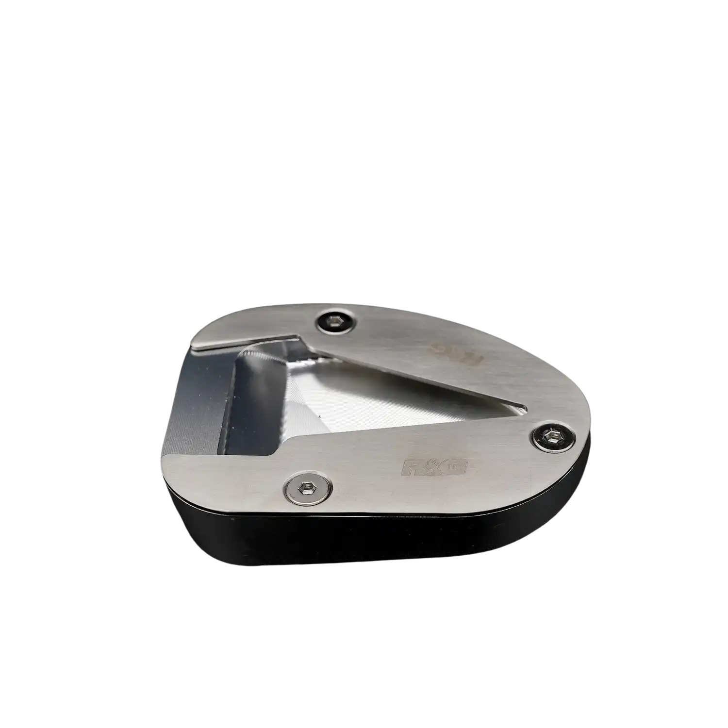 Kickstand Shoes bolt onto the bottom of the side stand, to enlarge the original’s footprint by up to 100%, significantly spreading the load placed upon it, to help prevent the stand ‘piercing’ the ground. Despite this enlargement, the Shoe does not affect ground clearance or interfere with the chain run during normal riding.